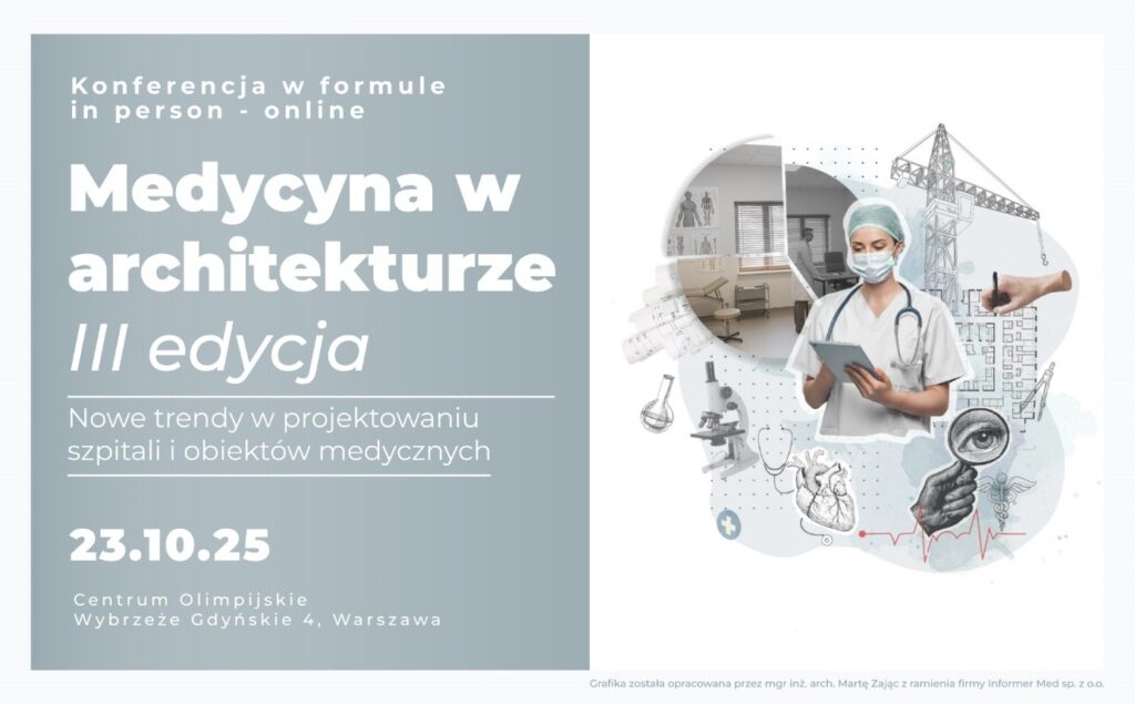 Już za niespełna 3 tygodnie, 23.10.2025 roku odbędzie się w warszawskim Centrum Olimpijskim trzecia edycja konferencji „Medycyna w architekturze”. Tym razem tematem głównym imprezy będą standardy projektowania obiektów infrastruktury medycznej sprzyjających procesom terapeutycznym, a obrady będą podzielone na części „Soma” i „Psyche”.